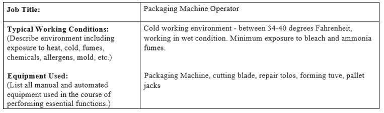 Mientras realiza las tareas de este trabajo, el empleado está expuesto a un ambiente de fabricación frío (34-36 grados F) y húmedo, olor a cloro, condiciones climáticas exteriores, superficies irregulares para caminar, maquinaria pesada, tráfico de montacargas y ruidos fuertes.