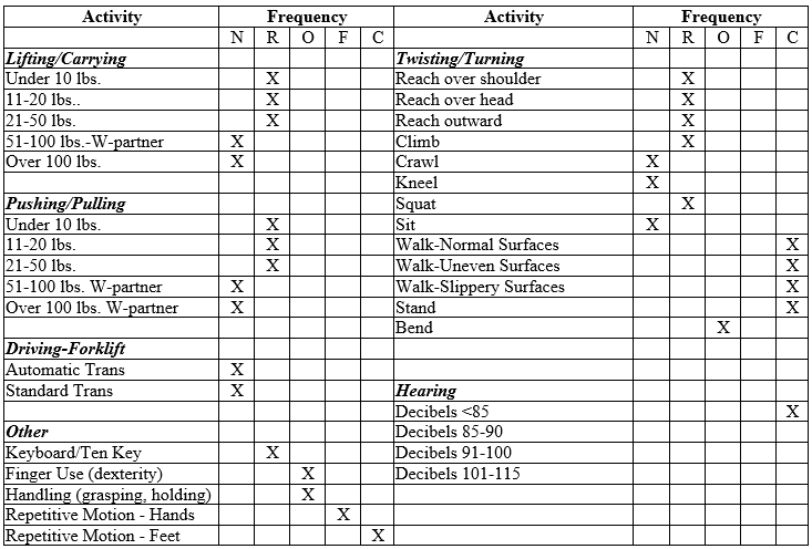 While performing the duties of this Job, the employee is exposed to a cold (34-36 degrees F) and wet manufacturing environment, the smell of chlorine, outside weather conditions, uneven walking surfaces, heavy machinery, forklift traffic and loud noise.