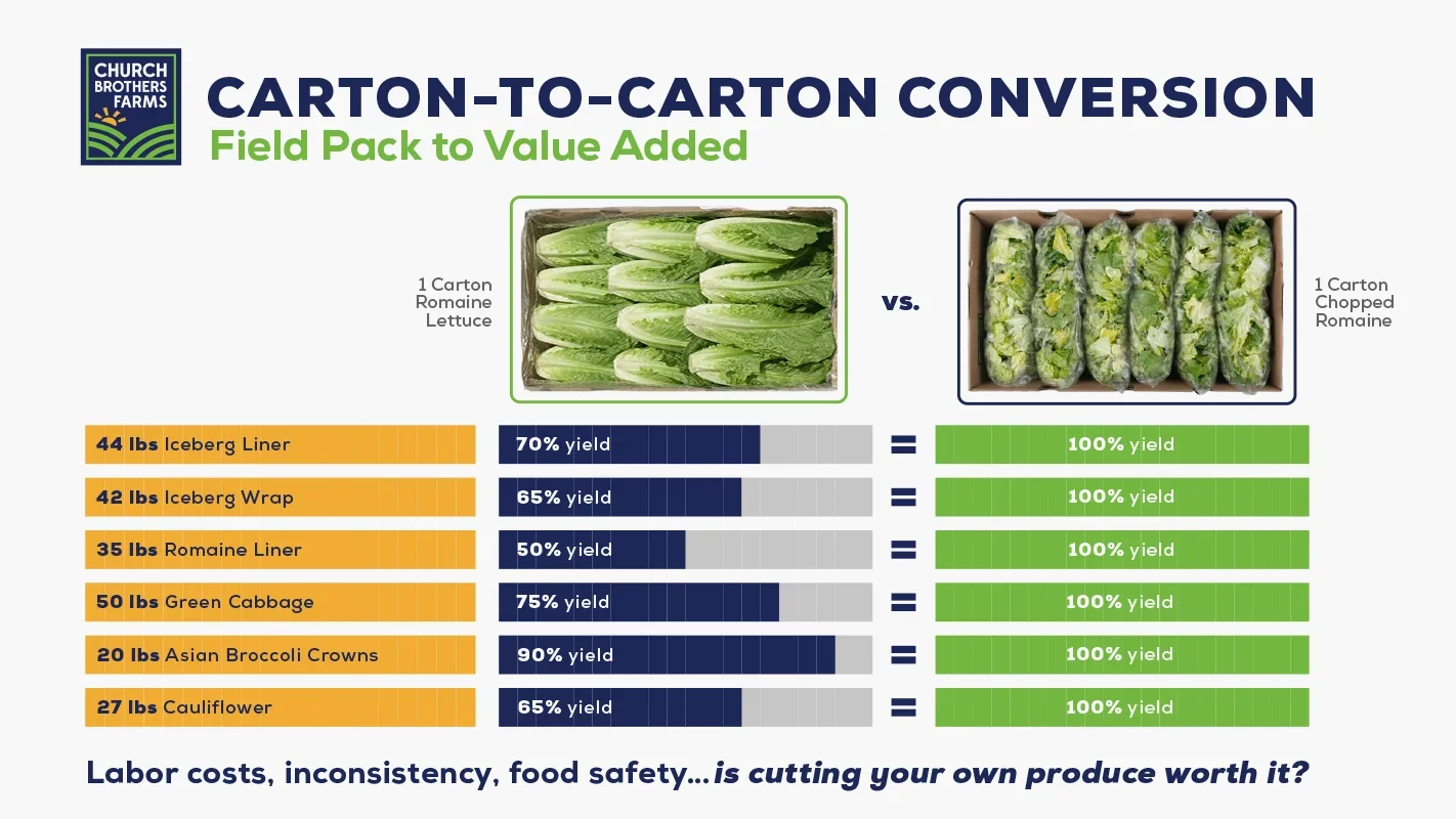 We get these questions often: How many heads are in the processed pack? This table is a tool to help answer those questions. The numbers* used in this table can not be used as product specifications and we recommend confirming your own yields to equate a final conversion rate.