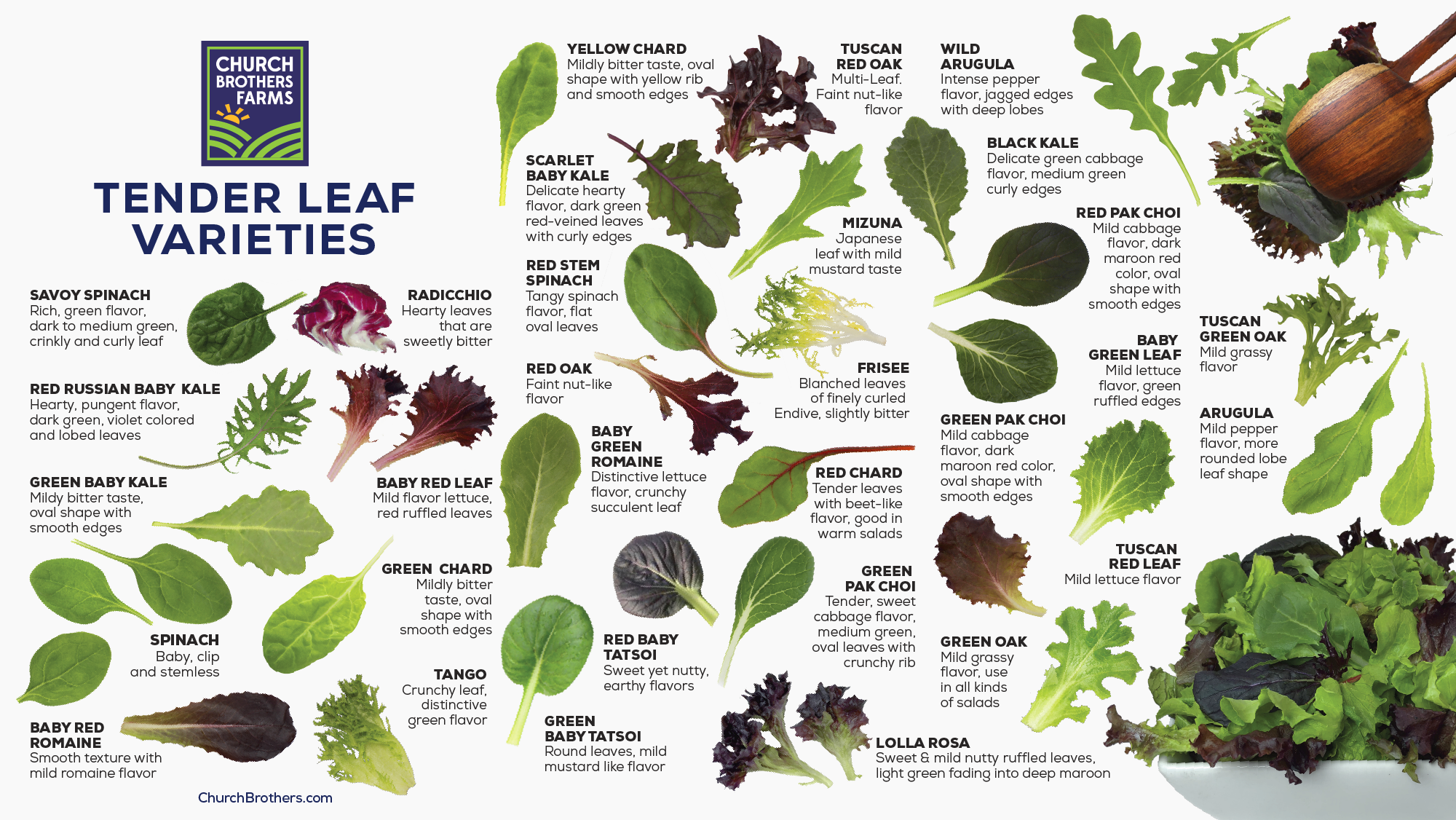The menu to the left shows all the tender baby leaf varieties commonly used for spring mix and custom blends. Tender leaf refers to any leafy greens that do not need any chopping, dicing, or shredding.