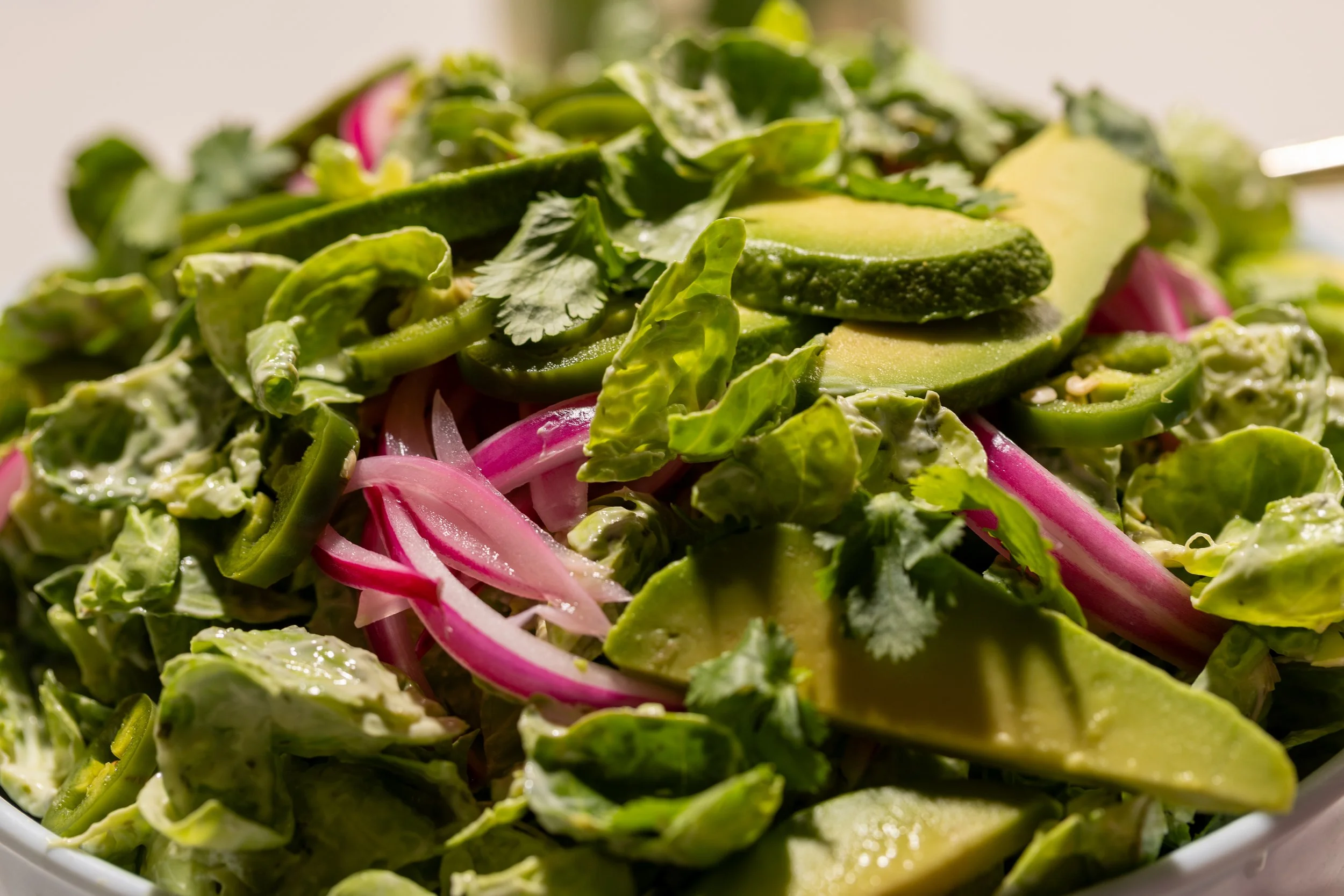 - Assemble: Toss the brussels sprouts with the dressing, salt and pepper. Arrange the pickled jalapeños, pickled onion, avocado and cilantro leaves on top. Spoon additional dressing on the side.