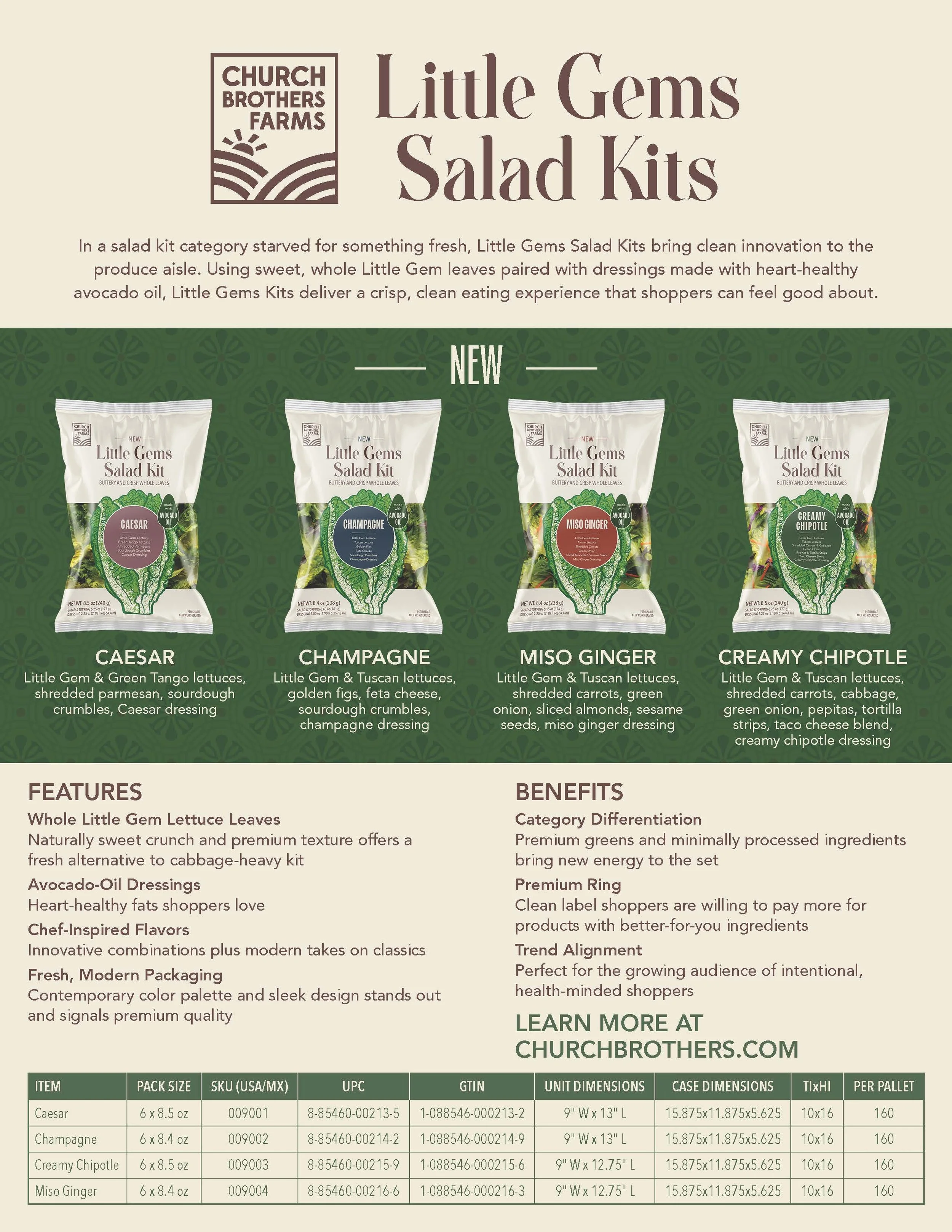 Sell Sheets Retail | Foodservice | Herbs | whole leaf | green onionS Retail Products Little Gems Salad Kits Retail Menu Convenience Veg Line Bulk Family Packs Club Packs Brussels Sprouts Green Beans Green Onions Little Gem Petite Romaine Ready to Use Romaine, Burger & Sandwich Leaf, Green Leaf, and Lettuce Boats Sugar Snap & Snow Peas Back to Top Food Service All Products | Tender Leaf | Specialty | Fresh Cut Salads & Slaws | Value Added Vegetables All Products Food Service Product Sheet Food Service Commodities Sheet Tender Leaf Tender Leaf Headquarters Arugula Baby Kale Blend Italian Greens Baby Kale Blend Spinach Tuscan SaladsThe Original & Organic Tuscan SaladsColor & Crunch Tuscan Salads Supreme Green Urban Blend Specialty Little Gem Petite Romaine Sweet Baby Broccoli Sweet Baby Cauliflower Sweethearts Tuscan Salads Farmer Selection Fresh Cut Salads & Slaws Fresh Cut Salads Menu Kale Chopped Rainbow Kale Kale Color Crunch Veggie Power Slaw Value Added Vegetables Bell Peppers Florets: Broccoli & Cauliflower Brussels Sprouts Back to Top Herbs Fresh Herbs Back to Top Whole Leaf Whole Leaf Menu Burger & Sandwich Leaf Whole Leaf Kale Ready Leaf Easy Pack Stack Pack Washed & Trimmed Romaine Back to Top Green Onions Green Onions Back to Top